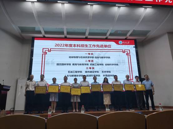 会上,学校对2022年度本科招生工作先进个人、突出贡献奖和先进单位进行了表彰。27名招生工作先进个人和19个先进单位获得表彰。副校长郭海敏宣读表彰文件,校领导分别为获奖单位和个人颁奖。