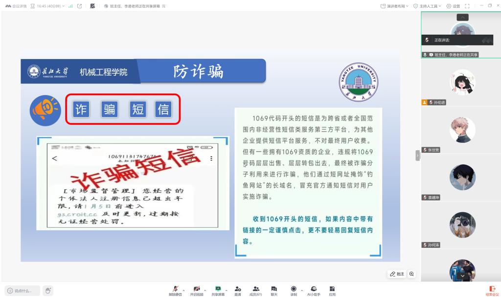 班会上,各年级辅导员、班主任首先就近期出现的“基孔肯雅热”、“登革热”传染性疾病防控工作进行了重点强调,提醒同学们注意个人健康监测,特别是近期有相关地区旅居史的学生须按要求上报相关信息并做好预防。同时,各班级围绕消防安全、交通安全、防诈骗、防溺水、网络安全等方面系统开展了安全教育,引导学生增强自我保护意识,提升风险防范能力。此外,就学生返校流程、动态监测机制、延迟返校申请程序等也进行了详细说明,确保每一位同学清楚返校要求与时间节点。