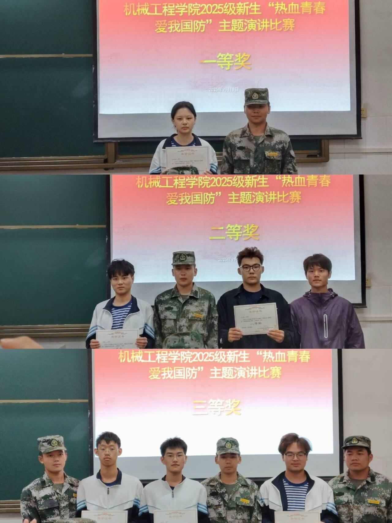 选手展示后,教官代表总结讲话,肯定选手表现,鼓励传承爱国精神。随后颁奖环节,3 人获三等奖,2 人获二等奖,1 人获一等奖,颁奖嘉宾为获奖者颁发证书。